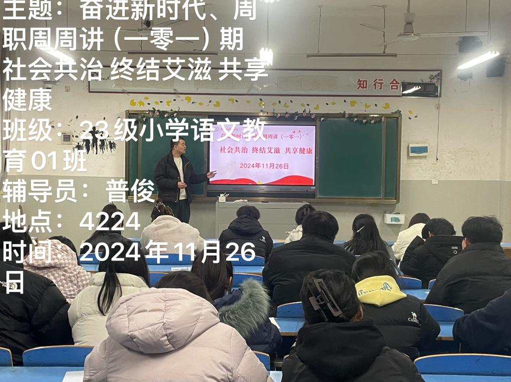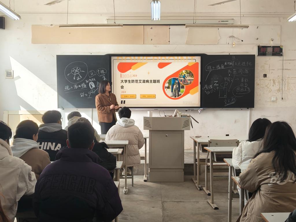 班会上,辅导员首先向同学们讲述了尊重、理解和关爱艾滋病人的重要性。随后,辅导员通过演示PPT、播放视频等方式,用通俗易懂的语言和生动的案例引导大家科学认识艾滋病,了解艾滋病病理知识、传播途径与预防措施,以及艾滋病检测方法与国家相关政策,让同学们深入了解艾滋病相关内容。