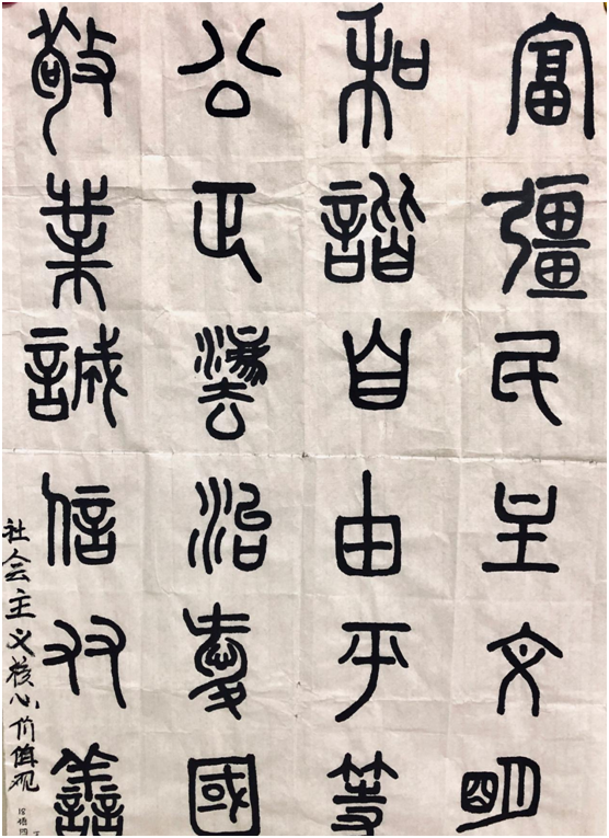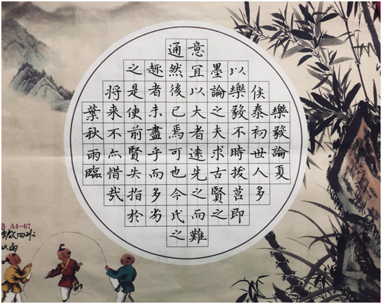 在比赛中大家尽情的挥毫泼墨,选手们都全神贯注于作品的创作中,一丝不苟,点横撇捺,工整美观,尽力表现出自己的最高水平,形成比赛中亮丽的风景线。纸上展现出的不只是一个个工整的字,更展现出的是他们深厚的书写功底。随着时间流逝,参赛选手纷纷完成了自己的创作。他们的作品中有刚正不阿的楷书,有古色古香的隶书,有潇洒飘逸的行书,连空气中都泛着一股淡淡的墨香,让我们深刻感受到中华传统文化的魅力。
