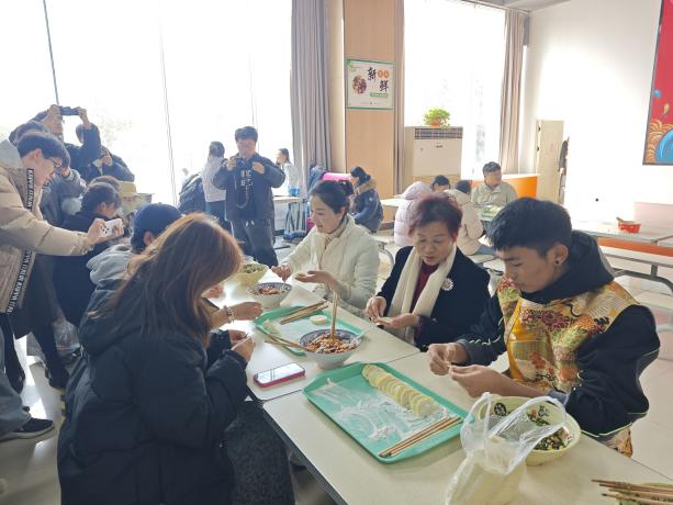 活动现场暖意融融,食堂内摆放着擀好的饺皮、调好的馅料,各类工具一应俱全。师生们围坐在一起,分工协作、默契配合:有的擀皮,有的包馅,有的捏褶,手法各异却都饱含热情。学校领导也参与其中,与同学们亲切交流,手把手指导包饺子的技巧,现场欢声笑语不断,一张张薄薄的饺皮在大家手中变成了形态各异的饺子,满满的幸福感在指尖传递。
