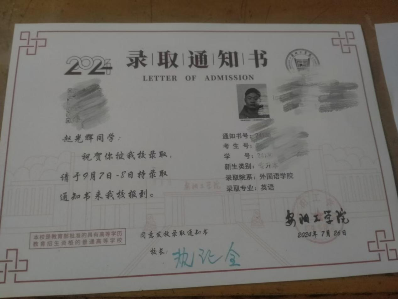 星光不问赶路人,时光不负有心人。赵光辉同学在2024年专升本考试中取得优异成绩,顺利被安阳工学院外国语学院英语专业录取,实现了人生梦想。