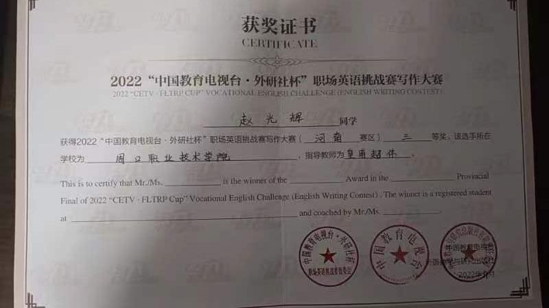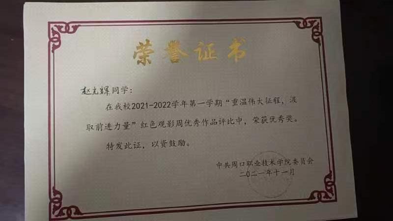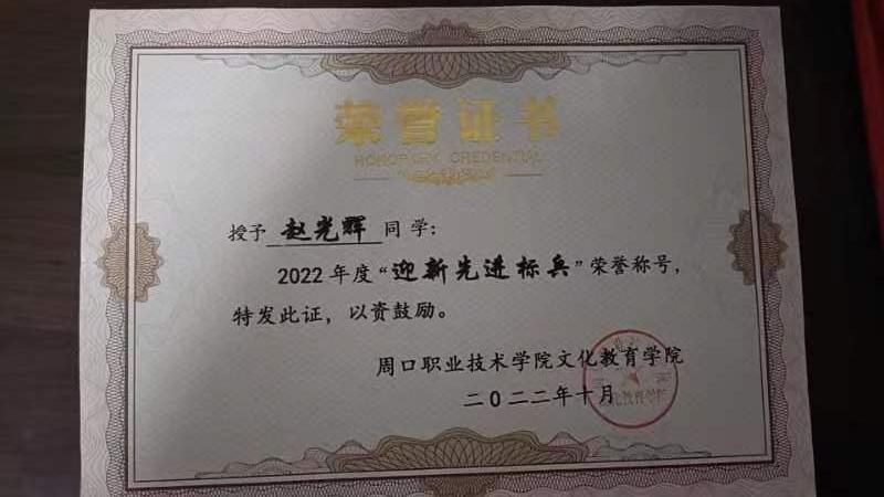 赵光辉同学在校期间目标明确、信心坚定,面对学习中的挫折和困难,从未有畏难或放弃的念头。他学习刻苦努力,上课认真听讲,专业知识扎实,成绩名列前茅,在全国大学英语四级考试中取得优异成绩,荣获校“重温伟大征程,汲取前进力量”红色观影周优秀作品优秀奖,“中国教育电视台 外研社杯”职场英语挑战赛写作大赛河南赛区三等奖。他身残志坚,热心公益活动,积极参与迎新服务,一天之内竟然走了3万多步,成为迎新工作中最“闪耀”的身影,被评为“迎新先进标兵”。