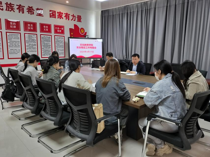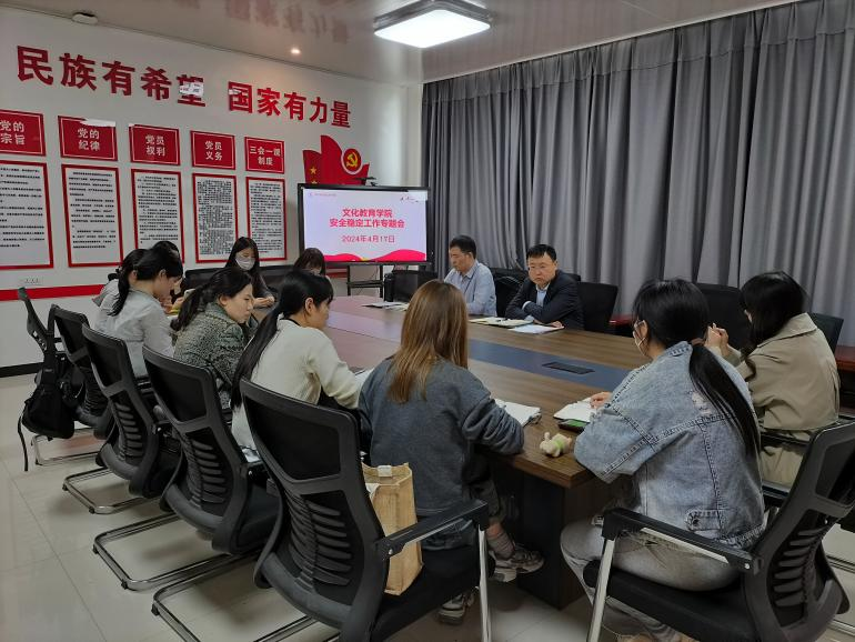为进一步加强pp电子官网学生安全稳定工作,文化教育学院4月17日在五区党员活动室召开学生安全稳定专题工作会议。党总支书记展贤东、学管办主任普俊以及全体辅导员参加此次会议。