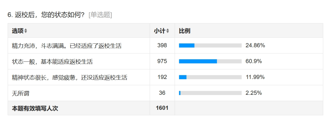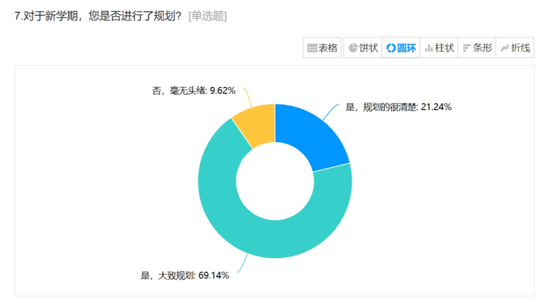 通过本次调查问卷发现部分学生还未及时调整状态进入新学期,希望同学们能尽快调整好状态以崭新的姿态,开启新学期,针对新学期的计划,同学们纷纷表示从自己规划好的学习计划开始,提高自己学习成绩、提升自身能力与素养、考取四六级证书、积极参加社团活动与社会实践、发展兴趣爱好,实现自我价值并不断完善自己的计划,为自己的未来而努力奋斗。