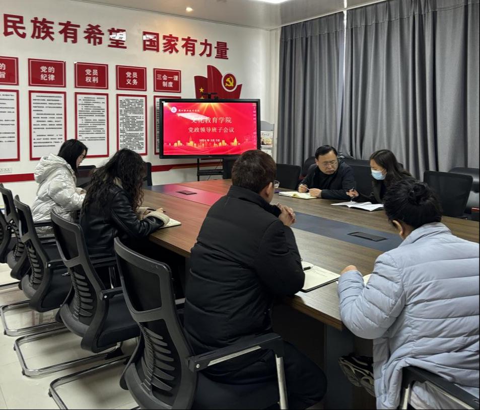 3月5日上午,文化教育学院在党建活动室召开党政联席会议。学院党总支书记展贤东、院长史丽珍等学院全体班子成员参加会议。会议由党总支书记展贤东主持。