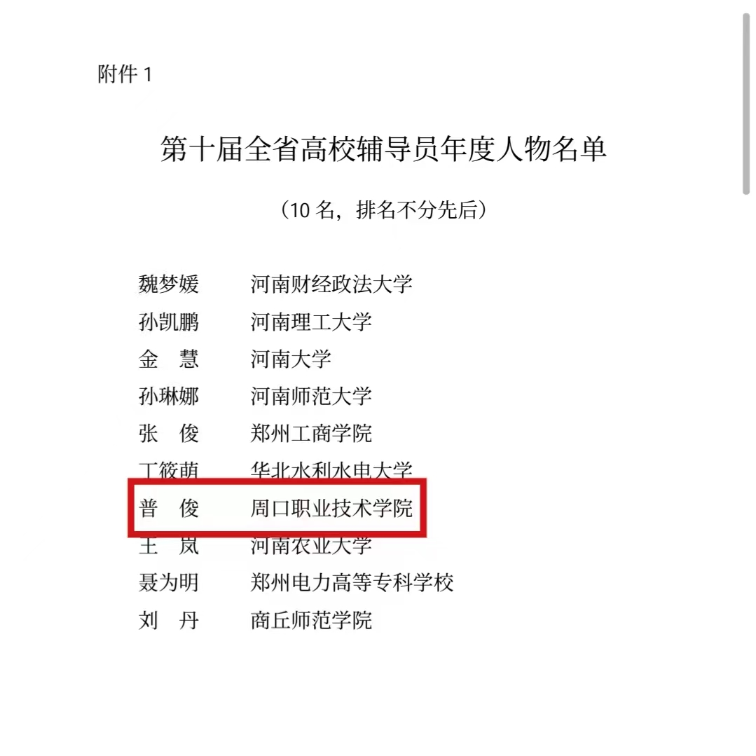日前,由中共河南省委教育工委河南省教育厅组织开展的“第十届全省高校辅导员年度人物”评选活动揭晓,pp电子官网普俊老师荣获“第十届全省高校辅导员年度人物”称号,这是我校参加该项评选活动获得的最高荣誉,也是周口市高校唯一获此殊荣的辅导员。