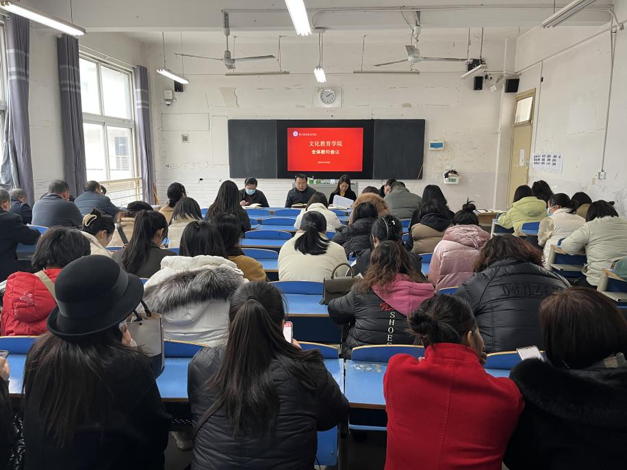 为传达落实近期学校相关会议精神,进一步推进学院各项工作,文化教育学院于11月29日下午,在4220教室召开了全体教师会议。参加此次会议的有文化教育学院党总支书记展贤东、院长史丽珍、教学副院长李炯、学管副院长于慧娟及学院全体教职工。会议由史丽珍院长主持。