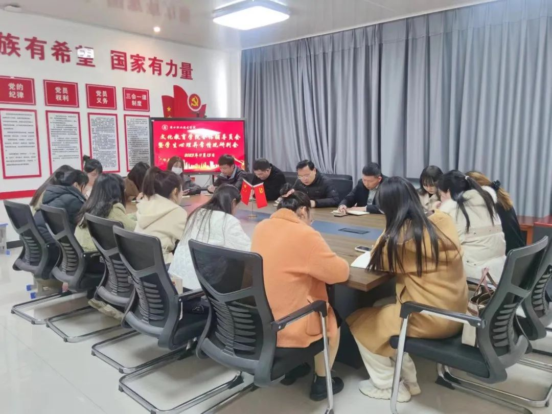 为促进学生健康成长,切实提升各辅导员应对学生心理问题方面的业务水平建设与辅导员队伍建设,11月13日,文化教育学院于五区二楼党员活动室召开辅导员会议暨学生心理异常情况研判会。