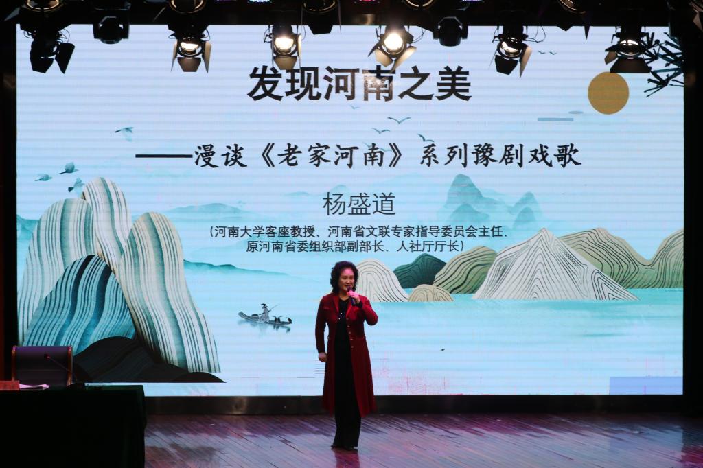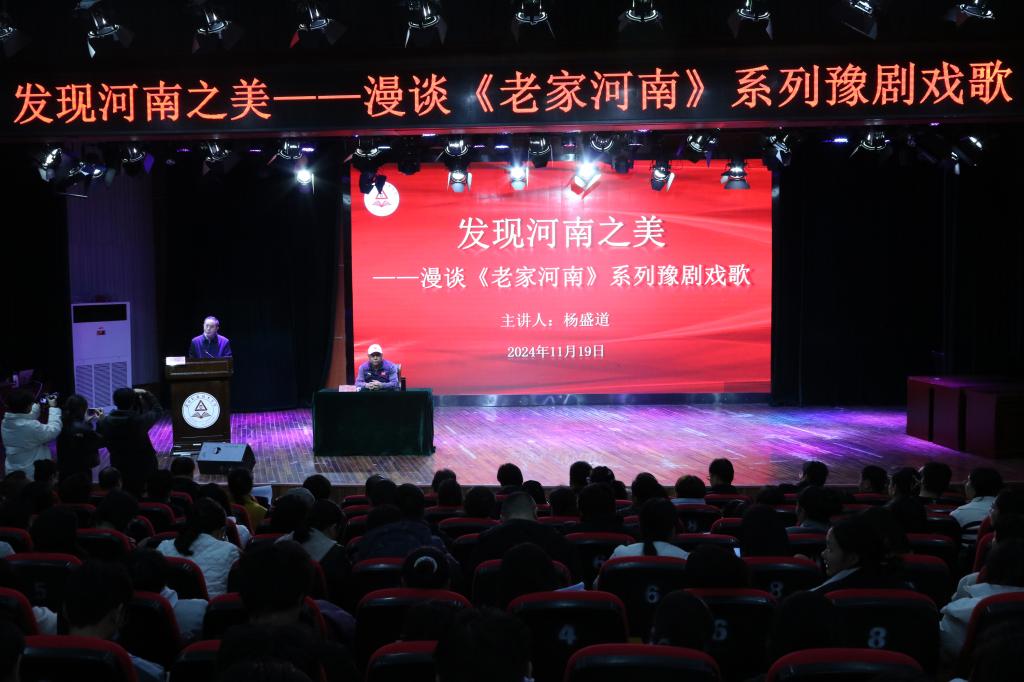 为了弘扬祖国优秀的传统文化,推进河南豫剧艺术的传承与发扬,加强同学们对豫剧的了解,以此更好地提升个人素养,坚定文化自信,凝聚中华民族共识,11月19日下午,pp电子游戏平台网站邀请河南大学客座教授、河南省文联专家指导委员会主任、原河南省委组织部副部长、人社厅厅长杨盛道教授在砺德厅开展“发现河南之美”——漫谈《老家河南》系列豫剧戏歌的讲座。讲座由校党委副书记,工会主席郭汝礼主持。pp电子游戏平台网站党总支书记展贤东、院长史丽珍以及部分教师和学生代表参加本次讲座。