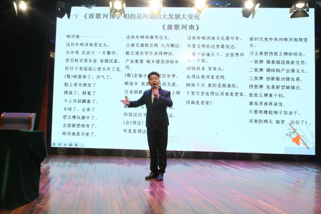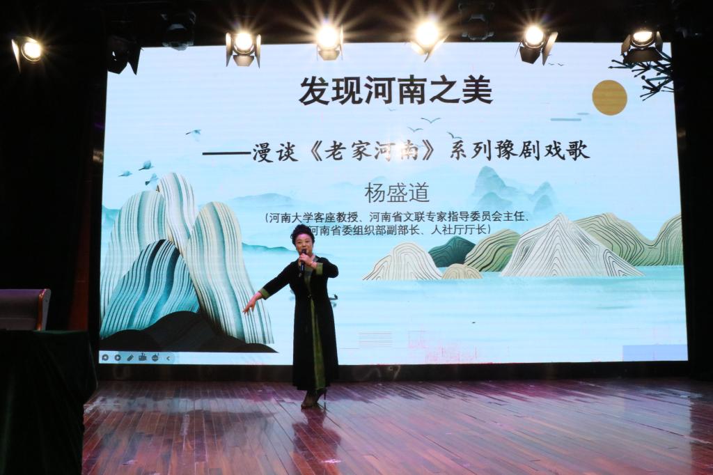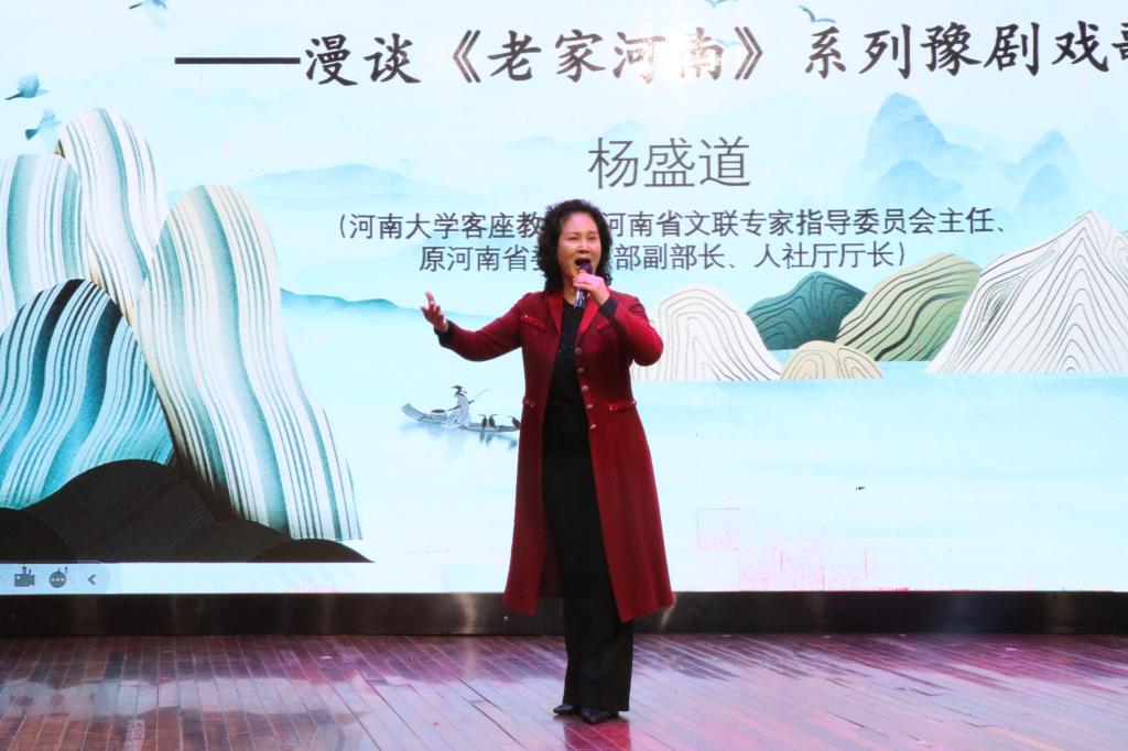 讲座伊始,杨盛道教授阐述了《老家河南》系列豫剧戏歌的起源发展历程、创作目的及其内容鉴赏等知识。杨盛道教授根据习近平在考察河南时的指示表示,当代青年在传承河南豫剧文化的同时要做好创新工作,更好地为促进河南豫剧事业的创新性发展做贡献,让全国人民真正了解河南、爱上河南。杨盛道教授讲解内容丰富,不仅针对“老家河南”豫剧艺术进行了全面地讲解,还鼓励同学们要积极参与相关社会活动。